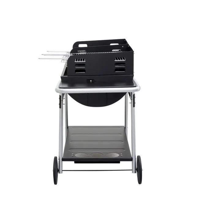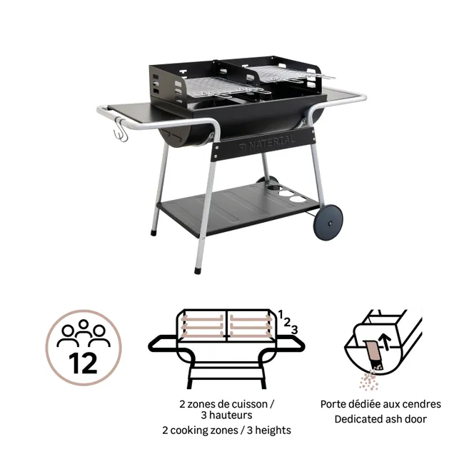 Procurando um churrasco de carvão perfeito para o seu terraço? O churrasco de carvão de Darius é o seu aliado! Refeições quentes adaptadas a todos os tipos de espaço É adequado para pequenos terraços e jardins espaçosos. Quando os dias ensolarados chegarem, compartilhe uma refeição de férias para 6, em torno de receitas que estão fora do comum. Reviva seus convidados, com espetos de abobrinha com pesto de manjericão ou um Camembert assado. Para garantir a grelha à temperatura ideal, sua área de cozimento está equipada com uma grade para ajustar a altura do cozimento. Vantagens técnicas O comprimido lateral e os ganchos permitem que você coloque as placas e tenha os utensílios à mão. Um comprimido inferior é dedicado a colocar sua bolsa de carvão. Dicas de manutenção: Darius pode ser facilmente limpo com um pano úmido e sabão neutro. Graças à sua lareira de ferro fundido, oferece durabilidade real no churrasco. É aconselhável o inverno seu churrasco sob uma cobertura (não inclusive) para não ser afetada por condições climáticas externas.