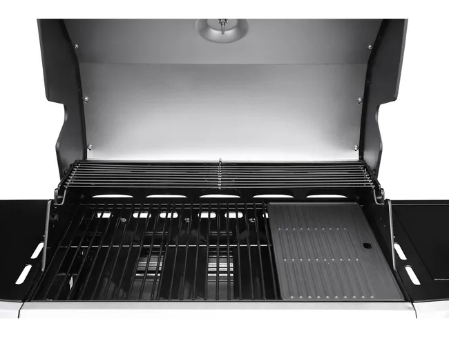 Características :- Churrasqueira a gás LED 4+1 queimadores – 15,2 kW de potência – 4 queimadores de 11,7 kW e 1 queimador lateral de 3,5 kW – Largura das prateleiras laterais: 34 cm – Coletor de graxa removível – 3 ganchos para pendurar os utensílios – Tipo de gás a utilizar: Butano ou Propano .Tamanho da grelha :67 x 44 cm – 2 grelhas + 1 tabuleiro de ir ao forno .Potência:De 15 a 20 KW.Quantidade de queimador:5.Grelha:Em ferro fundido esmaltado .Tampa:Aço inoxidável com cabo .Sistema de ignição:Ignição electrónica Push and Turn (Empurre e vire) – Botões LED de plástico cromado – Luz branca.Carrinho:Aço inoxidável – Base plástica .Dimensões :143 x 57 x 115 cm .Altura da cocção:87 cm.Cores:Prata.Vantagens:- Estrutura sólida – Design cuidadoso – Armário de arrumação de 2 portas – 4 rodas direccionais – Botões de comando cromados – Indicador de temperatura – Separador de gorduras amovível – Capa de protecção fornecida.Conselhos práticos:2 baterias LR20/D 1,5V Baterias não incluídas.Remessa:1 Pacote : 0,59 x 0,74 x 0,65 m, 48 kg .