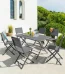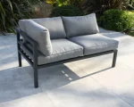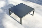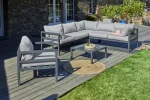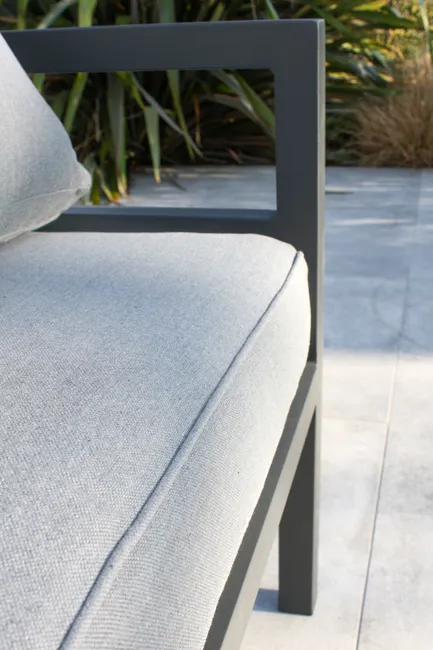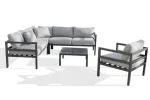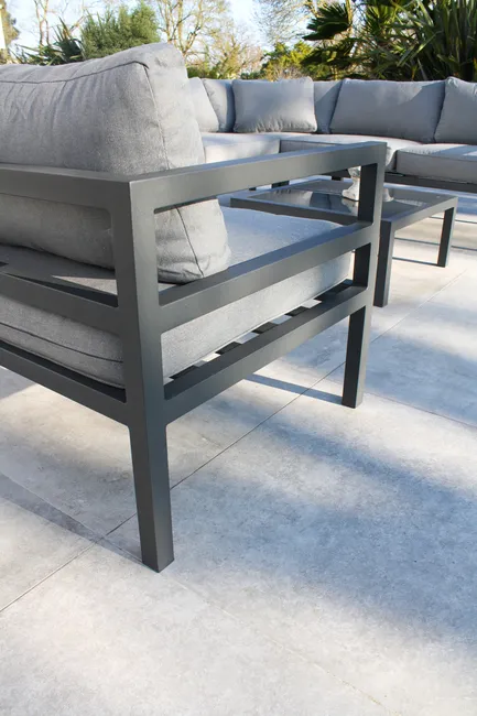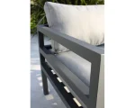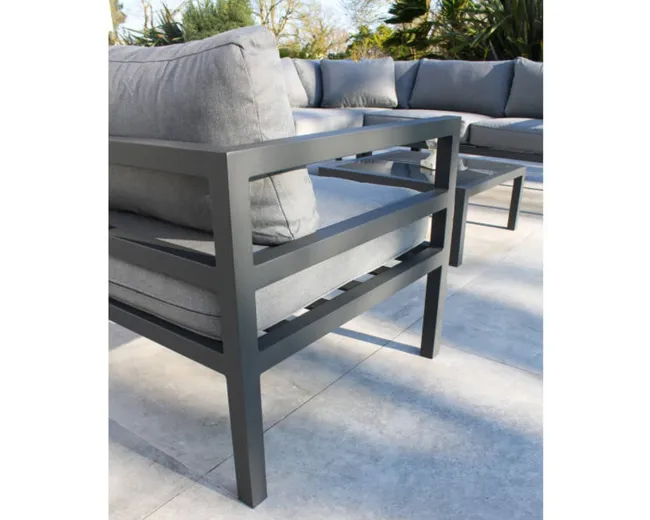 Conjunto de jardim de 6 lugares em alumínio cinza antracite composto por uma mesa de centro quadrada com tampo de vidro, 2 espreguiçadeiras de 2 lugares, um canto e uma poltrona. Almofadas com capas removíveis em lona cinza 100% poliéster. DIMENSíƒâ€¢ES Meridiano: C 145 x L 75 x A 64 cm Poltrona: C 79 x L 75 x A 64 cm Canto: C 75 x L 75 x A 64 cm Mesa: C 71 x L 71 x A 31,5 cm