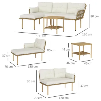 - Este conjunto inclui um sofá com chaise longue e um módulo de assento duplo, juntamente com uma mesa de centro, todos feitos de vime PE A mesa, totalmente em metal, é elegante e oferece um espaço prático para colocar objetos A estrutura de aço com revestimento em pó proporciona maior resistência e durabilidade ao ar livre O vime PE, tecido à mão, tem um visual clássico de vime e é resistente à água As almofadas dos assentos e as duas almofadas lombares proporcionam um conforto excepcional As capas das almofadas do assento podem ser removidas com fecho éclair para facilitar a limpeza. As capas das almofadas de encosto não são removíveis Este conjunto é adequado para jardins, varandas e pátios Recomendamos duas pessoas para a montagem, que pode demorar cerca de duas horas