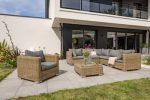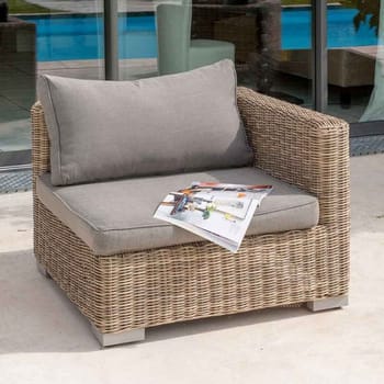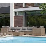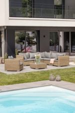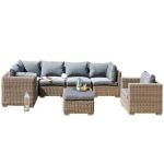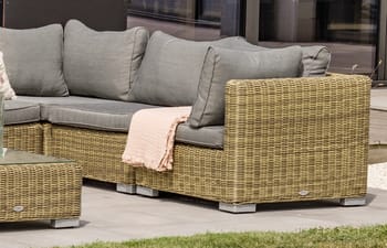 Conjunto de jardim de jardim em alumínio 6 lugares, resina trançada mel composto por 1 poltrona, 3 módulos de canto, 2 módulos centrais, 1 mesa de centro com tampo de vidro temperado. Almofadas removíveis 100% poliéster cinza. DIMENSíƒâ€¢ES Poltrona: C 84 x L 84 x A 65 cm Módulo: Canto: L 84 x L 84 x A 65 cm/Central: L 76 x L 84 x A 65 cm Mesa de centro: C 74,5 x L 74,5 x A 32 cm Espessura da almofada: Assento: 10 cm/Encosto: 21 cm