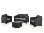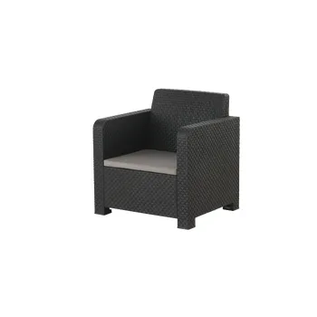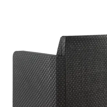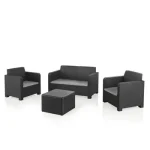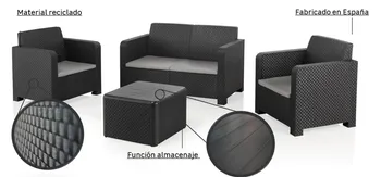Conjunto de jardim relax NATERIAL, ideal para varanda, terraço ou jardim. Constituído por uma mesa (50X40cm), 2 cadeirões (74X79X66cm) e um sofá de 2 lugares (132X79X66cm). Em resina injectada, polipropileno cinzento grafite, sendo estes materiais leves fáceis de mover e resistentes às intempéries, não enferrujando. Com este set são poupadas cerca de 700 toneladas de plástico por ano. 60% da estrutura efectuada com coberturas de estufas de plástico. Poupança dos recursos naturais e reciclagem de produtos poluentes.