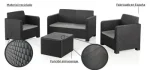 – Conjunto muito prático e fácil de montar – Totalmente em resina – incluindo encaixes – o que dispensa qualquer manutenção, quer faça sol ou chuva, evitando assim manchas e bolor – Mesa de centro que também serve como caixa de arrumação – ideal para guardar as almofadas