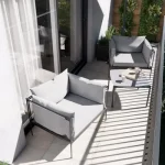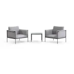 O conjunto de jardim baixo Levo é ideal para pequenos espaços. Inclui uma mesa de café e duas poltronas e foi concebido para oferecer um conforto óptimo. Um assento confortável O conjunto de jardim baixo Levo é perfeito para um pequeno terraço. É composto por uma mesa de café com tampo de vidro, que lhe dá uma superfície plana e estética, e duas poltronas. Cada poltrona tem um grande assento textileno flexível e 4 almofadas, 2 das quais são apoios de braços. São em poliéster, tratados com anti-UV para diminuir a descoloração e repelentes à água. Têm também um tocar mais suave e um aspeto visual semelhante ao do algodão. A estrutura do conjunto é de aço, o que oferece durabilidade e resistência ao seu conjunto. Linhas puras Simples e retilíneo, o design do conjunto Levo dá aos seus espaços um caráter moderno. Combine-o com o chapéu de sol Arkea para um resultado harmonioso. Dicas de manutenção Para assegurar uma longa vida útil ao seu mobiliário, aconselhamos a invernizá-lo sob uma capa impermeável Naterial. As almofadas são totalmente removíveis para facilitar a limpeza. A estrutura das almofadas pode ser facilmente limpa com um pano ligeiramente humedecido e sabão neutro. Em caso de corrosão, aplicar imediatamente um tratamento anti-ferrugem na área afetada.