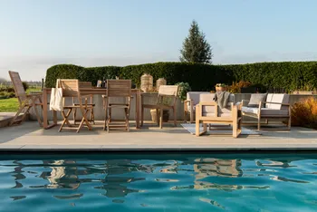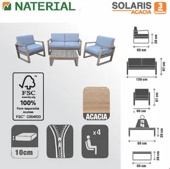 O conjunto de jardim com assentos baixos NATERIAL Solaris é composto por um sofá para duas pessoas, duas poltronas e uma mesa baixa. É fornecido com 4 almofadas de assento e 4 almofadas de encosto com capas amovíveis, feitas de poliéster impermeável. A sua base quadrada confere-lhe um aspeto simultaneamente estilístico e robusto, combinando na perfeição com a mesa NATERIAL Solaris. Os produtos das gamas NATERIAL Solis e Solaris são fabricados em madeira de acácia certificada FSC. O óleo de acabamento mantém o aspeto dourado natural da madeira. O rótulo FSC permite fazer escolhas informadas em relação a produtos provenientes de uma gestão florestal ambientalmente correcta, socialmente benéfica e economicamente sustentável.