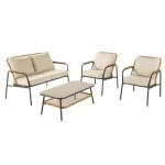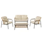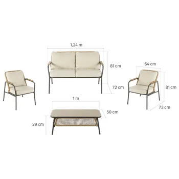 – Conjunto relax compacto, ideal para espaços exteriores pequenos – Para 4 pessoas – Mesa de centro com dois níveis de altura – Detalhes em rattan sintético – Estrutura robusta em aço, tratada com deposição eletroforética para maior resistência à corrosão