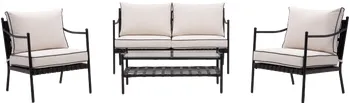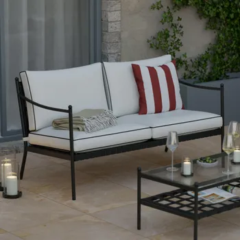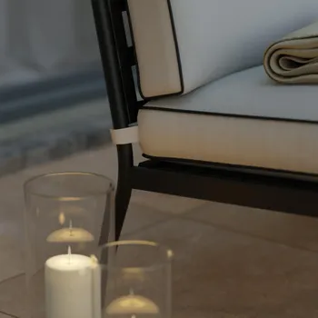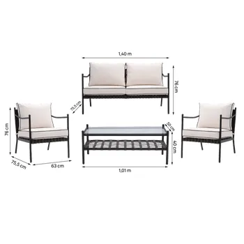 Um móvel de jardim romântico e simpático para receber os seus convidados rodeados pela natureza Tome um chá confortavelmente instalado no meio das plantas Pensado para criar um espírito romântico neoclássico, o mobiliário de jardim Victoria inclui um sofá para duas pessoas, duas poltronas individuais bem como uma mesa de café. Suas grandes almofadas brancas proporcionam um conforto ideal. Fabricados em poliéster, possuem tratamento anti-UV e repelente à água, permitindo limpar facilmente tarefas acidentais, e aderem à estrutura para permanecer no lugar mesmo em caso de vento. A mesa de centro Victoria e sua bandeja de vidro de fácil manutenção, deixam aparecer um trançado com efeito couro preto no piso inferior, permitindo instalar revista e sustentar o estilo bucólico do conjunto. Um charme tradicional Inspirado nos jardins ingleses, o conjunto Victoria traz um toque romântico aos seus exteriores e varandas. Seu aço preto reforça o efeito ferro forjado e associa-se ao tom branco das almofadas, cuja costura preta lembra a estrutura e vem para modernizar o conjunto. Para um conjunto bucólico completo, combine este mobiliário de jardim com a zona de jantar Victoria, com mesa e cadeiras que retomam o estilo e as vantagens da gama. Dicas de manutenção Práticos, os móveis de jardim Victoria requerem pouca manutenção. Sua estrutura de aço é facilmente limpa com pano úmido e produto neutro. Recomenda-se passar o inverno nas almofadas em local seco durante o inverno. Suas almofadas removíveis podem ser lavadas na máquina. Para preservar a sua qualidade, lembre-se de cobrir o seu mobiliário de jardim com uma capa Naterial para protegê-lo das intempéries. No caso de um ponto de corrosão, certifique-se de usar imediatamente um tratamento antiferrugem para evitar que se espalhe.