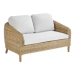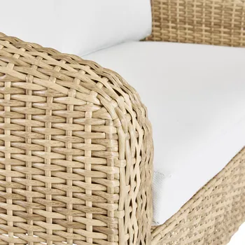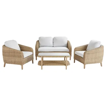 Desfrute de uma xícara de café no conforto do mobiliário baixo de jardim Odeon. Composto por um sofá de 2 lugares, duas poltronas individuais e uma mesa de centro, veste os seus espaços exteriores com um estilo boémio chique. Um conjunto acolhedor e prático Completo, o salão baixo com jardim Odeon acolhe 4 pessoas para um momento de convívio. As suas duas poltronas individuais e o seu sofá de 2 lugares oferecem um elevado nível de conforto que lhe dará vontade de prolongar as suas noites no terraço. As almofadas são acolhedoras e equipadas com efeito algodão, macias e agradáveis ao toque. Receberam um tratamento anti-UV e repelente à água para retardar o desbotamento e permitir a limpeza imediata de manchas acidentais. A mesa de centro é composta por duas bandejas para aumentar dez vezes o espaço disponível e garantir que você tenha tudo o que precisa para uma noite de sucesso. Para garantir a harmonia geral, todos os elementos do conjunto possuem imitação de rattan feito de resina de polietileno, material durável e resistente aos raios UV e à humidade. Projetada para garantir fácil manutenção e longa vida útil, a estrutura do Odeon é inteiramente feita de alumínio. Este material leve, combinado com ferragens de aço galvanizado, torna seu conjunto resistente à ferrugem e humidade. Linhas elegantes O conjunto Odeon oferece um charme autêntico e acolhedor ao seu terraço. Seu tecido inspirado no rattan traz uma suavidade boêmia à sua aparência geral. Seu design arredondado cria o efeito de uma bolha de relaxamento na qual você poderá relaxar. Para garantir a harmonia, um efeito madeira é estampado nas pernas das poltronas e da mesa. Complete o seu conjunto com o guarda-sol Aura branco. Dicas de manutenção Para preservar seu conjunto Odeon, recomendamos prepará-lo para o inverno em local livre de humidade ou protegê-lo com capa Naterial durante longos períodos de desuso. Da mesma forma, as almofadas são totalmente removíveis e devem ser protegidas da humidade quando não estiverem em uso. O alumínio pode ser facilmente limpo com pano úmido e produto neutro. As almofadas são acolhedoras e confortáveis, com um toque muito suave de “efeito algodão”. As almofadas são totalmente removíveis para fácil manutenção. Tecidos de poliéster, com tratamento anti-UV e hidrorrepelente, para resistir às intempéries