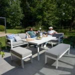 Composto por um conjunto modular que inclui um conjunto de mobiliário de canto para jardim, um banco e um banquinho, o conjunto de mobiliário de jardim Naxos II acomoda confortavelmente até 10 pessoas. Prática para o dia a dia, a sua mesa de altura média permite-lhe desfrutar de aperitivos, refeições ou uma noite de jogos. Quer relaxar? O seu sofá possui um assento reclinável integrado na sala, o que lhe permite deitar-se sem ter de se isolar.