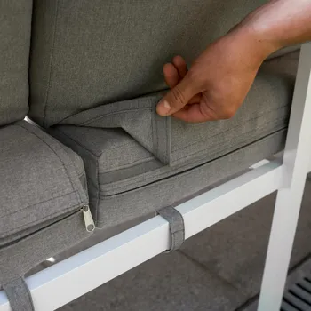 Ajustável, o ângulo pode ser posicionado para a direita ou para a esquerda dependendo da configuração do seu terraço. As almofadas traseiras são fixadas às almofadas do assento através de tiras de velcro para permanecerem no lugar em condições de vento.