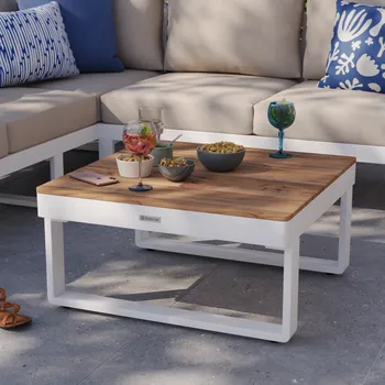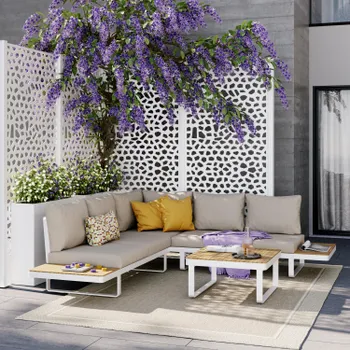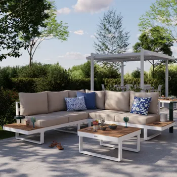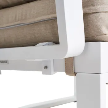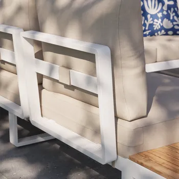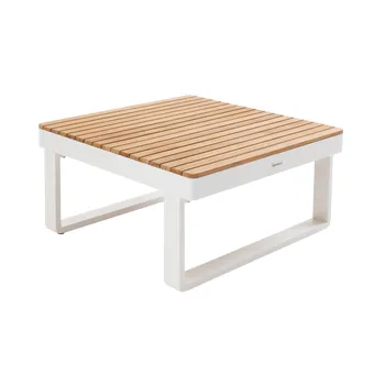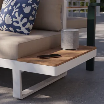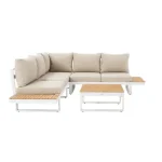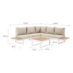 Desfrute de uma pausa para café no terraço do salão de canto Persea. Concebida para acomodar até cinco pessoas, esta sala de estar é composta por um grande sofá de canto e uma mesa de centro quadrada. Fabricado com uma estrutura em alumínio branco, este lounge possui prateleiras laterais em madeira de teca para ter sempre as suas bebidas ou pertences por perto. As almofadas de poliéster bege oferecem um conforto ideal. Fáceis de manter, são impermeáveis e amovíveis, podendo ser fixados à estrutura para evitar a resistência ao vent