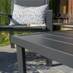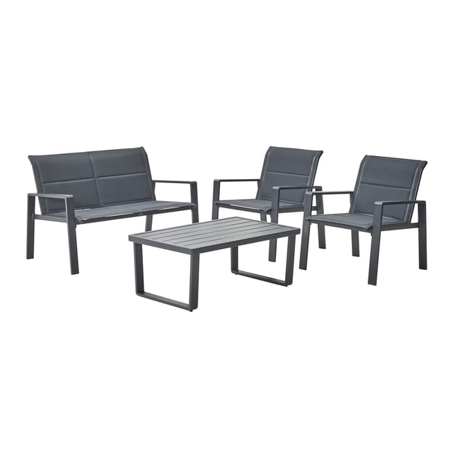 Fabricado em alumínio, é leve, fácil de mover e resistente às intempéries, sendo ideal para uso prolongado no jardim, terraço ou varanda. Os assentos acolchoados em textilene oferecem um excelente nível de conforto e adaptam-se perfeitamente aos momentos de lazer ao ar livre, sem limitações.