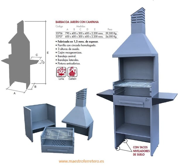 Churrasqueira de jardim para lenha e carvão vegetal com capuz de 800 mm. 3 alturas – Fabricado em 1,5 mm. de espessura. – Churrasqueira com zincado aprovado. – 3 alturas de grelhagem. – Gaveta de recolha de cinzas. – Bandeja central. – Bandejas laterais. – Pintura anticalórica – Medidas: 790 x 400 x 300 x 400 x 400 x 400 x 2.200 mm. – Peso: 59.500 Kg. – A entrega é feita na rua.