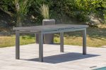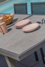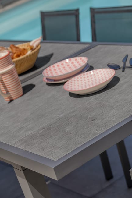 Mesa de jardim em alumínio cinza antracite com tampo em cerí¢mica com aspecto de pedra natural e extensíƒÂ£o automática. DIMENSíƒâ€¢ES C 190/250 x L 95 x A 77 cm