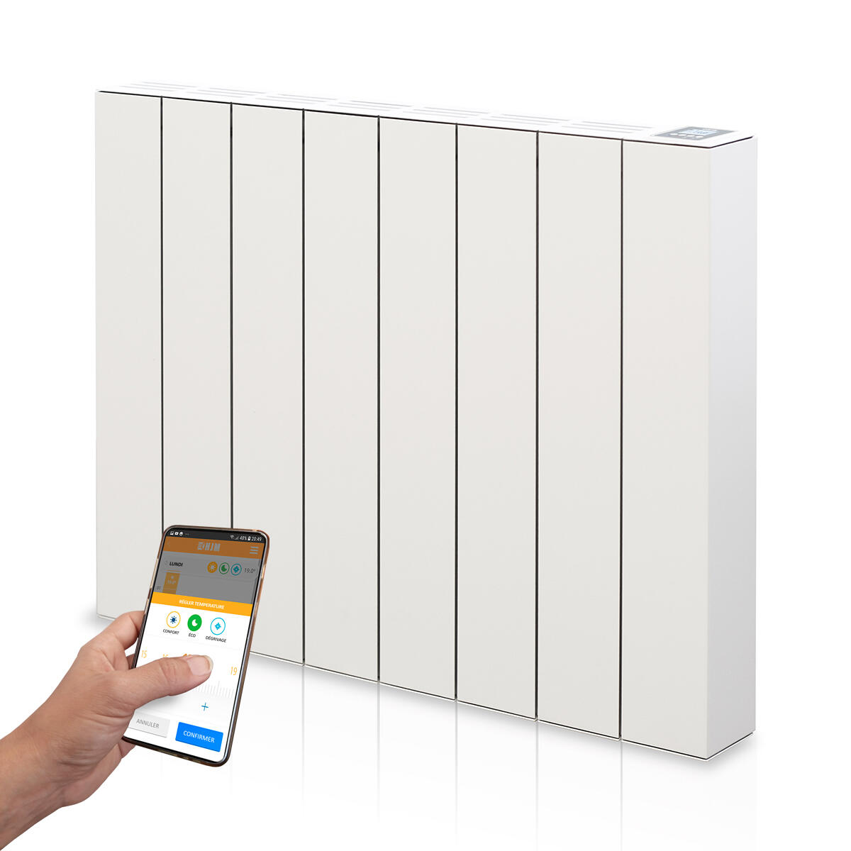Radiador elétrico ligado à inércia cerâmica. A elevada inércia térmica dos blocos cerâmicos continua a emitir calor mesmo após ser desligado. Gera um calor suave e envolvente, garantindo o máximo desempenho para um calor agradável, uniforme e duradouro. Design extraplano. Fachada de alumínio. CONECTADO: A partir do seu smartphone e através da nossa aplicação gratuita HJM, pode controlar o sistema de aquecimento de uma ou mais divisões, de onde quiser, quando quiser, e visualizar e ajustar a temperatura, programar os seus radiadores remotamente e gerir as suas ausências. Só precisa de uma ligação Wi-Fi onde tem os radiadores instalados e onde pretende programar ou controlar a instalação através do seu dispositivo móvel. Modo automático/manual, com 1 programa livre. Programação 24 horas por dia, 7 dias por semana. MODOS: PILOT WIRE, COMFORT, NIGHT, ANTI-GEO, BOOST, AUTO, MANUAL, OFF As suas funções permitem-lhe poupar na utilização e garantir conforto e segurança, graças a: • Geolocalização GPS: Detecta ausências/presenças • Compatível com ALEXA, GOOGLE: utiliza comandos de voz • Detetor de janela aberta. • Sistema inteligente de arranque antecipado. • Bloqueio parental. • Limitador térmico de segurança.