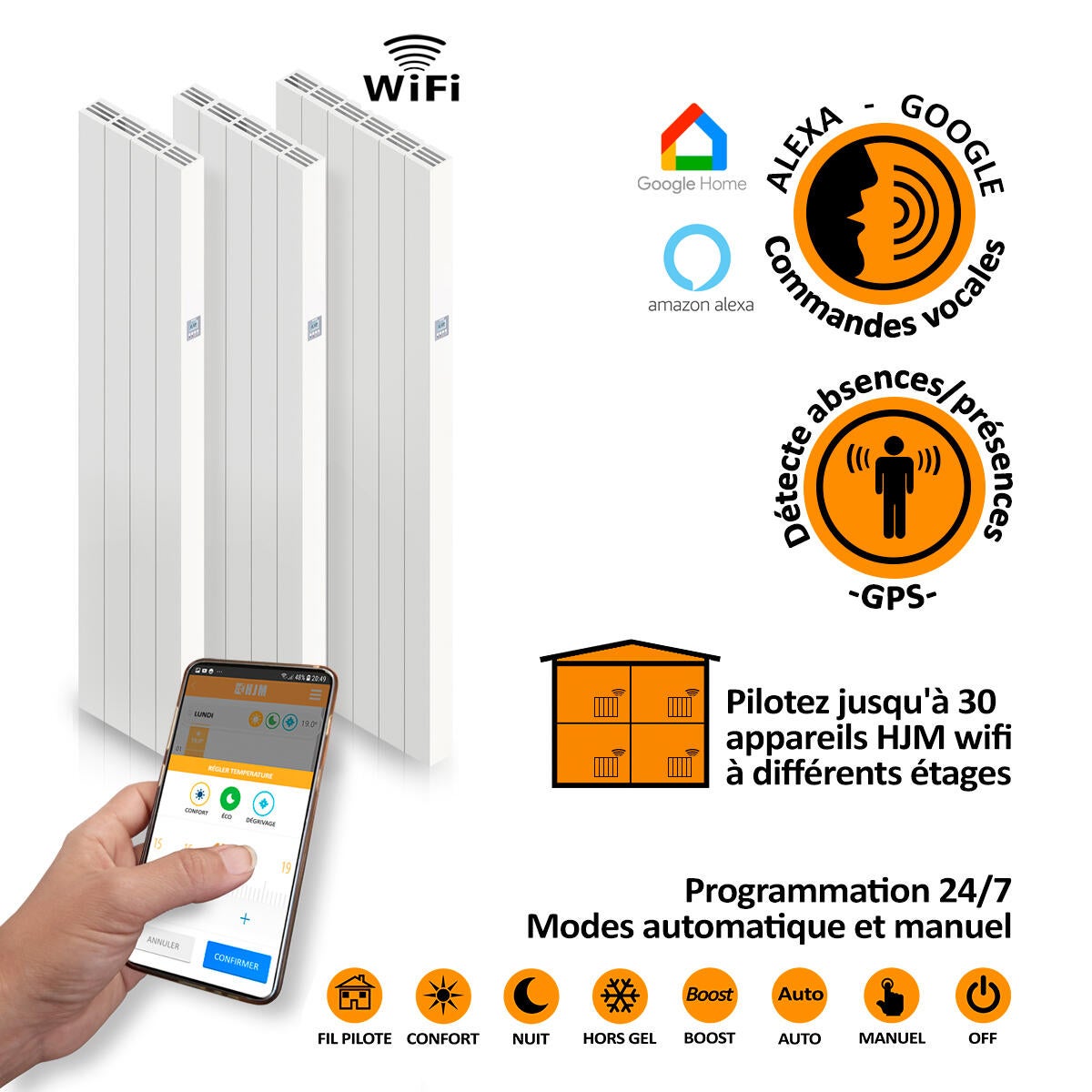 Radiador elétrico ligado à inércia cerâmica. A elevada inércia térmica dos blocos cerâmicos continua a emitir calor mesmo após ser desligado. Gera um calor suave e envolvente, garantindo o máximo desempenho para um calor agradável, uniforme e duradouro. Design extraplano. Fachada de alumínio. CONECTADO: A partir do seu smartphone e através da nossa aplicação gratuita HJM, pode controlar o sistema de aquecimento de uma ou mais divisões, de onde quiser, quando quiser, e visualizar e ajustar a temperatura, programar os seus radiadores remotamente e gerir as suas ausências. Só precisa de uma ligação Wi-Fi onde tem os radiadores instalados e onde pretende programar ou controlar a instalação através do seu dispositivo móvel. Modo automático/manual, com 1 programa livre. Programação 24 horas por dia, 7 dias por semana. MODOS: PILOT WIRE, COMFORT, NIGHT, ANTI-GEO, BOOST, AUTO, MANUAL, OFF As suas funções permitem-lhe poupar na utilização e garantir conforto e segurança, graças a: • Geolocalização GPS: Detecta ausências/presenças • Compatível com ALEXA, GOOGLE: utiliza comandos de voz • Detetor de janela aberta. • Sistema inteligente de arranque antecipado. • Bloqueio parental. • Limitador térmico de segurança.