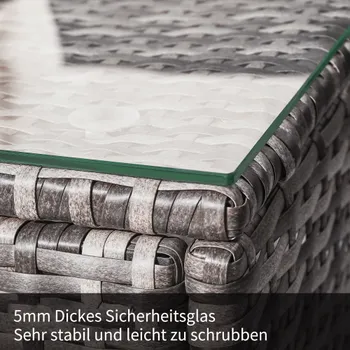 Materiais de alta qualidade:O polirratã resistente e anti-UV é firmemente entrelaçado com uma estrutura de aço com pintura eletrostática para oferecer um suporte sólido. Este tipo de móvel exige pouca manutenção e tem longa durabilidade.