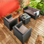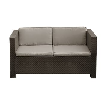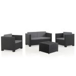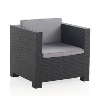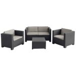 Set de muebles de resina, modelo Diva Confor, para decoración de zonas exteriores como jardines y terrazas. Mobiliario de alta calidad, sin componentes metálicos para así evitar la oxidación, fabricado con materiales reciclados, resistente a los rayos UV y las inclemencias del tiempo. Conjunto compuesto por un sofá de dos plazas, dos sillones individuales, cojines en el asiento y el respaldo y una mesa baja de centro. Color: Grafito. Medidas sillón (AlxProfxL): 72x66x74 cm. Medidas sofá (AlxProfxL): 72x66x132 cm. Medidas mesa (AlxProfxL): 34x57x57 cm.