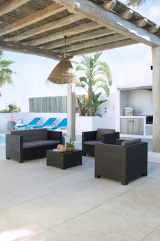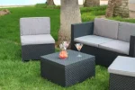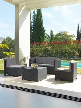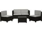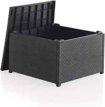Set de muebles de resina, modelo Diva Confort Storage, para decoración de zonas exteriores como jardines y terrazas. Mobiliario de alta calidad, montaje rápido y sencillo, sin componentes metálicos para así evitar la oxidación, fabricado con materiales reciclados, resistente a los rayos UV y las inclemencias del tiempo. Conjunto compuesto por dos sillones individuales, un sofá y una mesa storage que permite guardar todo lo que necesites. Color: Grafito. Medidas sillón (AlxProfxL): 72x66x74 cm. Medidas sofá (AlxProfxL): 72x66x132 cm. Medidas mesa (AlxProfxL): 43x65x65 cm.