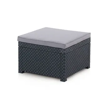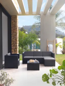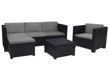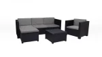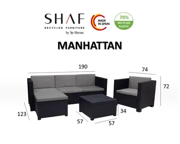 Conjunto Manhattan para decoración exterior de jardines y terrazas. Mobiliario de resina sin componentes metálicos para evitar la oxidación, fabricado en España con materiales reciclados. Set compuesto por un sofá de tres plazas, un sillón individual, un puf y una mesa baja de café. Además, se incluyen cojines para respaldo y asiento. Color: Grafito. Medidas sillón (AlxProfxL): 72x66x74 cm. Medidas sofá (AlxProfxL): 72x66x190 cm. Medidas mesa (AlxProfxL): 34x57x57 cm. Medidas puf (AlxProfxL): 39x56x56 cm.