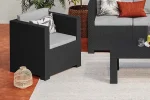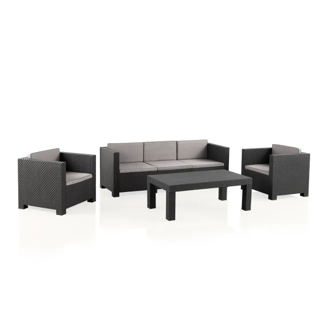 Adequado para uso interior e exterior graças à sua composição de resina injectada, o mobiliário de jardim Tropea Anthracite também tem uma estrutura de polipropileno. Com um assento confortável e resistente à água, as almofadas são removíveis, laváveis e feitas de tecido repelente à água.